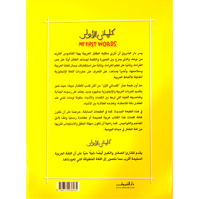 هذا القاموس الفريد من نوعه، والذي يمزج بين الصورة والكلمة ليساعد الطفل أولاً على حب القراءة، وثانيًا على تعلم القراءة، وثالثًا على استكشاف جمال لغتنا العربية وسلاستها، وأخيرًا يساعده على التعرف على مفردات اللغة الإنجليزية المقابلة للألفاظ العربية.